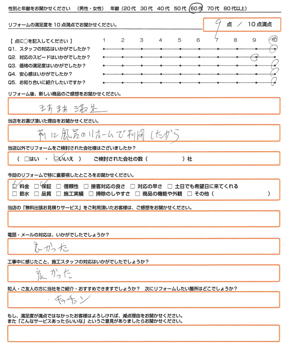 大津市 エコキュート取替のお客様のご感想 2025年10月30日 最終更新日時 : 2025年9月12日 2025年10月30日 【お客様のコメント】Q. リフォーム後、新しい商品のご感想をお聞かせください。 まあまあ満足 Q. 当店を選ばれた理由をお聞かせください。 前に風呂のリホームで利用したから Q. 当店以外でリフォームを検討された会社様はございましたか? いいえ Q. 今回のリフォームで特に重要視したところをお聞かせください 料金・保証 Q. 当店の「無料出張お見積りサービス」をご利用頂いたお客様は、ご感想をお聞かせください - Q. 電話・メールの対応は、いかがでしたでしょうか? 良かった Q. 工事中に感じたこと、施工スタッフの対応はいかがでしたでしょうか? 良かった Q. 知人・ご友人の方に当社をご紹介・おすすめできますでしょうか?次にリフォームしたい箇所はどこでしょうか? キッチン Q. もし、満足度が満点ではなかったお客様はよろしければ、減点理由をお聞かせください。また「こんなサービスあったらいいな」というご意見がありましたらお聞かせください。 -