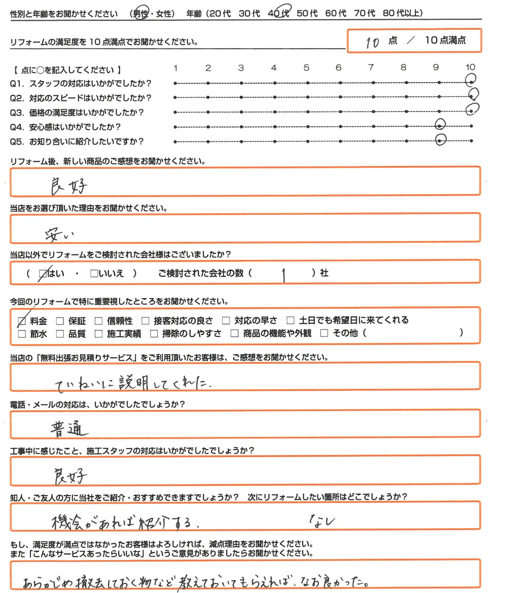 大津市 エコキュート取替のお客様のご感想 2026年2月27日 最終更新日時 : 2026年1月19日 2026年02月27日【アンケートの内容】Q. リフォーム後、新しい商品のご感想をお聞かせください。 良好 Q. 当店を選ばれた理由をお聞かせください。 安い Q. 当店以外でリフォームを検討された会社様はございましたか? はい 【ご検討された会社の数】 1社 Q. 今回のリフォームで特に重要視したところをお聞かせください 料金 Q. 当店の「無料出張お見積りサービス」をご利用頂いたお客様は、ご感想をお聞かせください ていねいに説明してくれた Q. 電話・メールの対応は、いかがでしたでしょうか? 普通 Q. 工事中に感じたこと、施工スタッフの対応はいかがでしたでしょうか? 良好 Q. 知人・ご友人の方に当社をご紹介・おすすめできますでしょうか?次にリフォームしたい箇所はどこでしょうか? 機会があれば紹介する なし Q. もし、満足度が満点ではなかったお客様はよろしければ、減点理由をお聞かせください。また「こんなサービスあったらいいな」というご意見がありましたらお聞かせください。 あらかじめ撤去しておく物など教えてもらえればない良かった