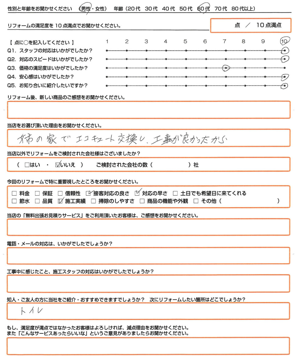 守山市 エコキュート取替のお客様のご感想 2025年9月19日 最終更新日時 : 2025年9月12日 2025年09月19日 【お客様のコメント】Q. リフォーム後、新しい商品のご感想をお聞かせください。 - Q. 当店を選ばれた理由をお聞かせください。 姉の家でエコキュート交換し、工事が良かったから Q. 当店以外でリフォームを検討された会社様はございましたか? いいえ Q. 今回のリフォームで特に重要視したところをお聞かせください 接客対応の良さ・対応の早さ・施工実績 Q. 当店の「無料出張お見積りサービス」をご利用頂いたお客様は、ご感想をお聞かせください - Q. 電話・メールの対応は、いかがでしたでしょうか? - Q. 工事中に感じたこと、施工スタッフの対応はいかがでしたでしょうか? - Q. 知人・ご友人の方に当社をご紹介・おすすめできますでしょうか?次にリフォームしたい箇所はどこでしょうか? トイレ Q. もし、満足度が満点ではなかったお客様はよろしければ、減点理由をお聞かせください。また「こんなサービスあったらいいな」というご意見がありましたらお聞かせください。 -