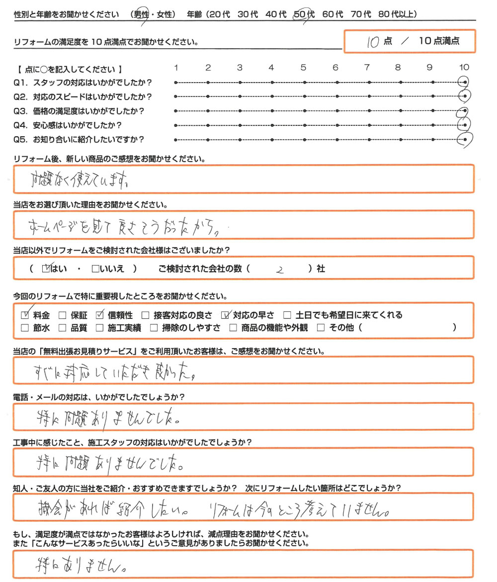 湖南市 エコキュート取替のお客様のご感想 2025年10月24日 最終更新日時 : 2025年9月12日 2025年10月24日 【お客様のコメント】Q. リフォーム後、新しい商品のご感想をお聞かせください。 問題なく使えています。 Q. 当店を選ばれた理由をお聞かせください。 ホームページを見て良さそうだったから。 Q. 当店以外でリフォームを検討された会社様はございましたか? はい 【ご検討された会社の数】 2社 Q. 今回のリフォームで特に重要視したところをお聞かせください 料金・信頼性・対応の早さ Q. 当店の「無料出張お見積りサービス」をご利用頂いたお客様は、ご感想をお聞かせください すぐに対応していただき良かった。 Q. 電話・メールの対応は、いかがでしたでしょうか? 特に問題ありませんでした。 Q. 工事中に感じたこと、施工スタッフの対応はいかがでしたでしょうか? 特に問題ありませんでした。 Q. 知人・ご友人の方に当社をご紹介・おすすめできますでしょうか?次にリフォームしたい箇所はどこでしょうか? 機会があれば紹介したい。 リフォームは今のところ考えていません。 Q. もし、満足度が満点ではなかったお客様はよろしければ、減点理由をお聞かせください。また「こんなサービスあったらいいな」というご意見がありましたらお聞かせください。 特にありません。