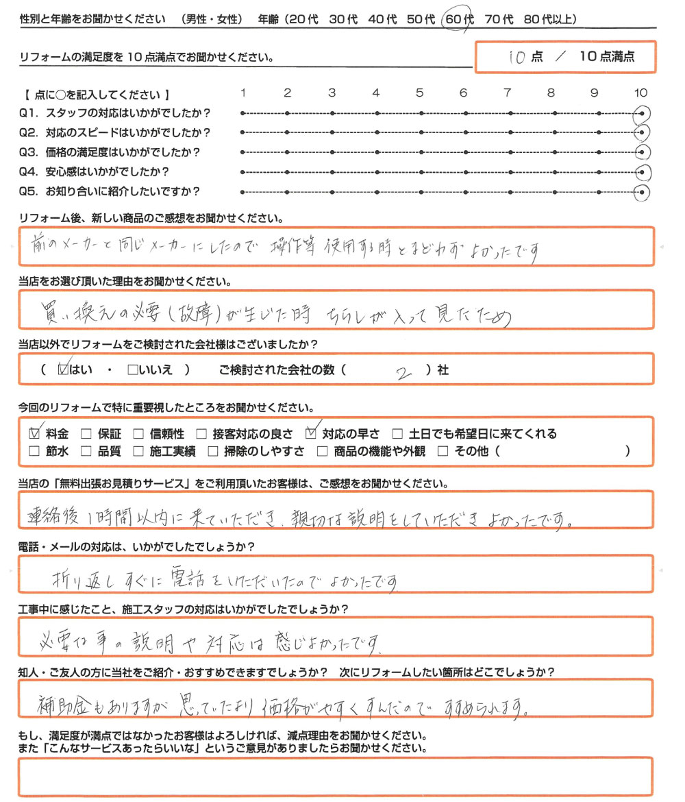 粟東市 エコキュート取替のお客様のご感想 2025年10月2日 最終更新日時 : 2025年9月12日 2025年10月02日 【お客様のコメント】Q. リフォーム後、新しい商品のご感想をお聞かせください。 前のメーカーと同じメーカーにしたので操作等使用する時とまどわずよかったです Q. 当店を選ばれた理由をお聞かせください。 買い換えの必要(故障)が生じたとき ちらしが入って見たため Q. 当店以外でリフォームを検討された会社様はございましたか? はい 【ご検討された会社の数】 2社 Q. 今回のリフォームで特に重要視したところをお聞かせください 料金・対応の早さ Q. 当店の「無料出張お見積りサービス」をご利用頂いたお客様は、ご感想をお聞かせください 連絡後1時間以内に来ていただき、親切な説明をしていただきよかったです。 Q. 電話・メールの対応は、いかがでしたでしょうか? 折り返しすぐに電話をいただいたのでよかったです Q. 工事中に感じたこと、施工スタッフの対応はいかがでしたでしょうか? 必要な事の説明や対応は感じよかったです Q. 知人・ご友人の方に当社をご紹介・おすすめできますでしょうか?次にリフォームしたい箇所はどこでしょうか? 補助金もありますが、思ってたより価格がやすくすんだのですすめられます。 Q. もし、満足度が満点ではなかったお客様はよろしければ、減点理由をお聞かせください。また「こんなサービスあったらいいな」というご意見がありましたらお聞かせください。 -